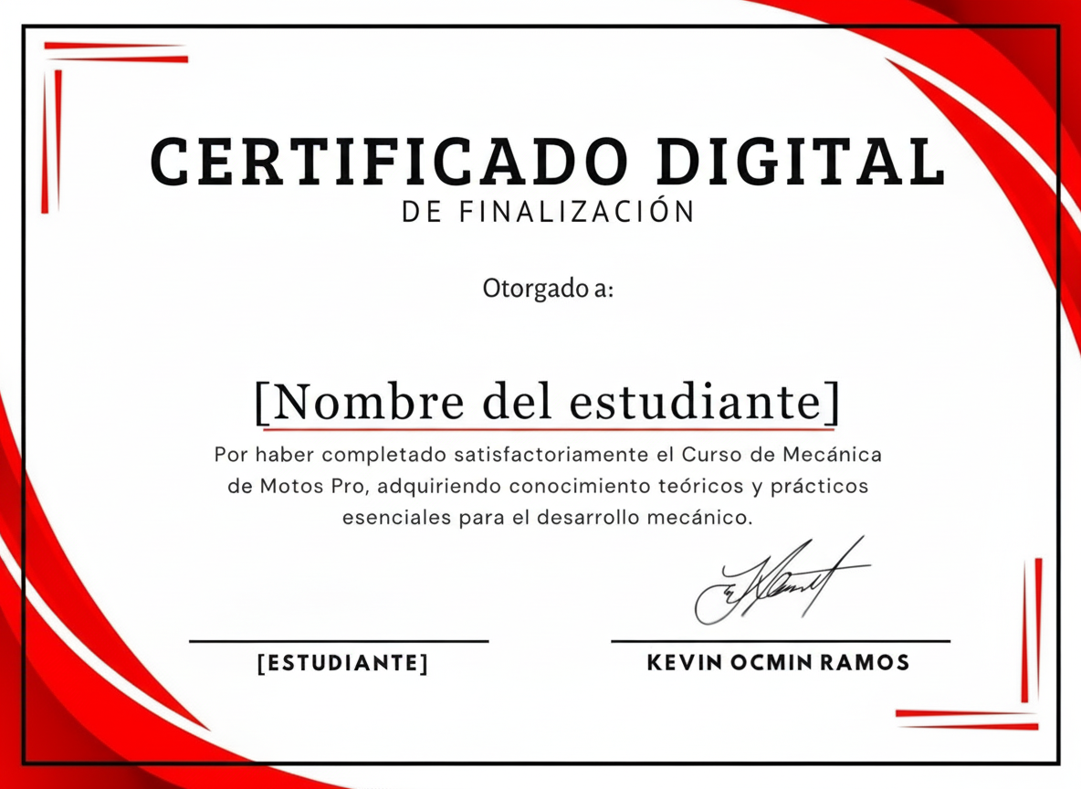 Al finalizar el curso, recibirás un Certificado Digital personalizado que acredita tus habilidades en diagnóstico, mantenimiento y reparación de motocicletas. Este documento profesional valida tu formación ante talleres, clientes y futuros empleadores, otorgándote mayor confianza, credibilidad y oportunidades reales de trabajo. Un reconocimiento que eleva tu perfil y te diferencia como técnico capacitado.